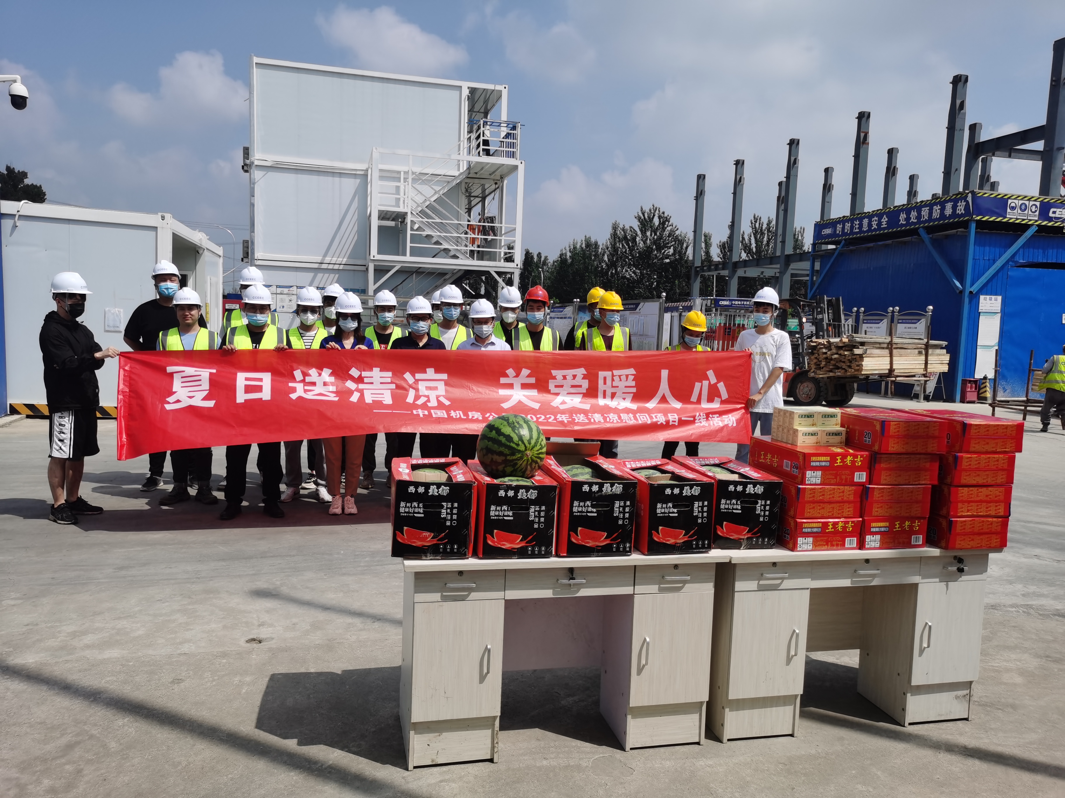 入夏以来,持续的高温和突发的异常气候变化给大家的工作和生活都带来了极大的不便。炎夏飞火,烈日炎炎。面对酷暑,我们的项目一线人员依然坚守岗位,不畏高温“烤验”,头顶烈日,为项目建设挥汗如雨,为了抢工期,抓进度,所有人都迎“热”而上,埋头苦干与烈日较劲,为项目施工进程的顺利推进做出了重要贡献。为此公司工会特为项目一线人员准备了防暑降温物品,由公司领导带队到各个项目现场进行慰问,为坚守一线的职工送去关怀。